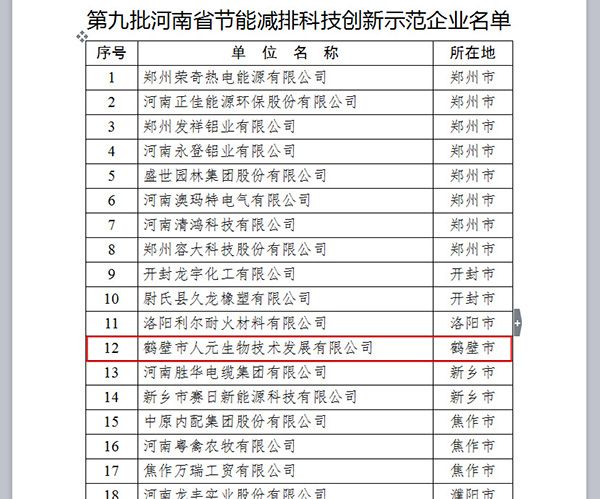 熱烈祝賀人元公司榮獲“河南省節(jié)能減排科技創(chuàng)新示范企業(yè)”